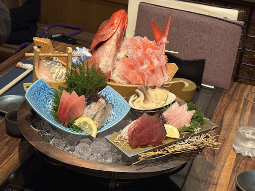 まずは、お通しがめちゃ美味しい😋これだけで日本酒いけちゃいます! また、お造りのうみさちもりは看板メニューだけあって、お頭付きでこれまた豪華で最高でした♪ (最後にお頭は、あら汁にして貰いました!)