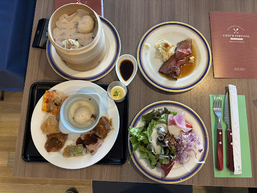 Cosmopolitan dishes like roast beef & curry alongside sushi at a hotel buffet with cooking stations.