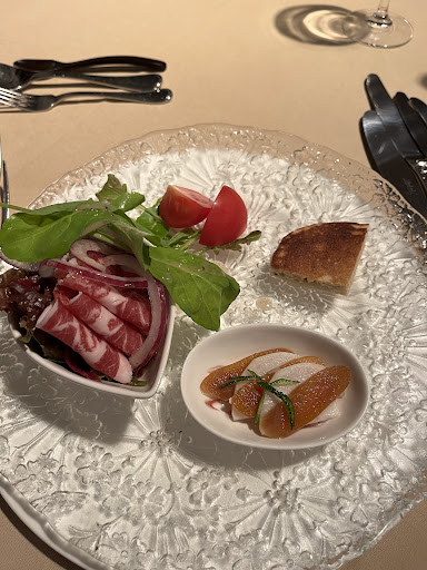当日直前に電話予約し、一人で伺いましたがフルコースを用意してくれました。 前菜は生ハムやカラスミのプレート、フォアグラのソテー、カニのムース、オマール海老のソテー、グラニテ、メインとデザートは四つから選べますが鴨のコンフィ、洋梨のコンポートを。