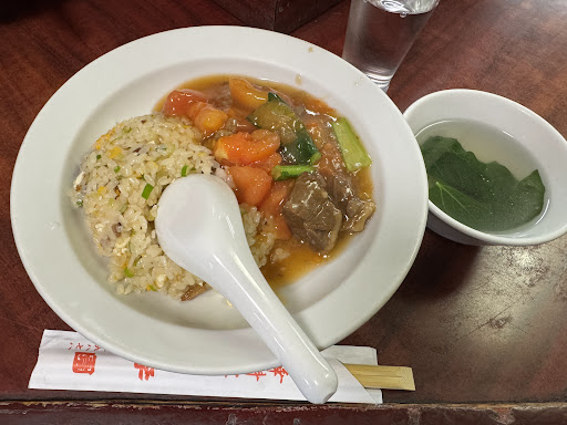 横にあるトマトソースはそのものが持つ酸味、肉の持つ旨みが炒飯と一緒に口に入れると、なんとも旨味のハーモニーが生まれる。 炒飯の具材はチャーシュー、玉子、ネギ。炒飯と牛肉トマトという足し算の料理ではなく、二つが組み合わさると別次元の新ジャンルメニューになっている。なんだろ?『シン•旨み相乗炒飯』とでも名付けておこうか。