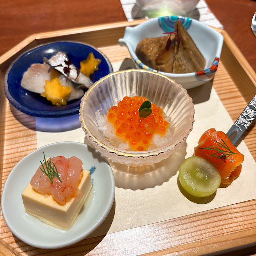 🥢先付ハ丈 ・鰆麹焼き・サーモンとシャインマスカット ・鬼おろしといくら・豚の角煮・卵豆腐 甘海老