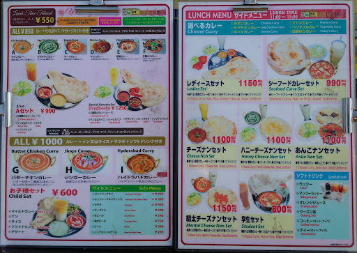 *Aセット:990円 ・カレー選べる2種類:チキンカレー、マトンカレー(辛さ普通) ・ナン ・ドリンク:マンゴーラッシー ・ミニサラダ