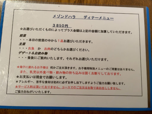 お昼を狙っていたのですがなかなか予約が取れず、ディナータイムに訪問しました。 基本が3,850円のプリフィックスで、前菜、主菜のチョイスによってプラス料金がかかるものがあれば加算する感じです。 メニューの赤い文字は加算無しで選べるもの、他はそれぞれの追加料金がかかります。 前菜にスモークサーモン、レバームースにサラダを追加。 メインに魚料理と豚ロースを選択。 デザートと紅茶コーヒーをいただき、ドリンクを1杯ずつ飲みました。