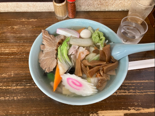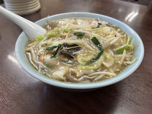 オーダー率50%と思われる看板のサンマーメンは細麺で一般店の2倍くらいで餡掛け野菜の量が多く、少食の方は少な目でオーダーした方が美味しくいただけると思う。薄めの味付けで小生にはピッタリですが、濃い目が好きな人には机上に味変アイテムがあるのでご安心くださいw