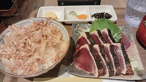 Read more旧東海道沿い、横浜保土ケ谷区にある松原商店街の中にあります。 YouTubeでこちらのお店を紹介しているのを見て、気になったので行ってきました。 遠洋カツオ一本釣り漁船5隻を所有する船元直営の食堂で、「おいしいカツオを味わってほしい」との思いから、漁師自慢のかつおを提供しているとのこと。 訪れたのは平日金曜日の13時過ぎ。店内はカウンター席が6席と2人掛けテーブル席が3卓というこじんまりとしたお店。壁には丸い船窓があったりと操舵室の雰囲気を醸し出す店内は、綺麗で落ち着く雰囲気でした。ランチタイムには少し遅めだったのもあり、すぐに着席出来ました。 藁焼き定食が人気だということだったので、赤身定食(¥¥1,080)ととろ定食(¥1,350)を注文。定食にはご飯と味噌汁、惣菜2品、漬物が付いてきます。+380でお味噌汁が濃厚つけ汁小うどんに変更できるということだったので、赤身定食の方はそちらに変更しました。それとご飯には注文時に無料のおかかを付けるかどうか聞かれるので、どちらもおかか乗せでお願いしました。 こちらのお店はカツオ自慢だけあって、注文を受けてから店頭で藁焼きにしてくれます。10分ほどして運ばれてきました。 テーブルには藻塩・日光丸のタレ・だし醤油が置いてあり、藁焼きの美味しい食べ方の説明書きが貼られています。 なので、説明に沿ってまずはそのままカツオのタタキを食べてみました。店頭で藁焼きしてくれているだけあって、香ばしい風味を感じられ食欲をそそります。そして今まで食べたものとは全然違って、臭みもなく美味しい!藻塩も美味しいですが、添えられたオニオンスライス、小口ネギ、スライスにんにくとともに、日光丸のタレで頂くのも、柑橘のタレが良く合って美味。箸が止まりません。ちなみに赤身ととろの違いは、赤身は暖かい海、とろは寒い海で捕れるそうで、赤身はさっぱり、とろは脂がのっています。 ご飯にはあふれんばかりのおかかが乗っていましたが、こちらにはだし醤油をかけて頂くと、これまたホントに美味しい!! お味噌汁から変更した濃厚つけ汁うどんはというと、つけ汁がその名の通り濃厚な出汁がき効いていて驚くほど美味。のどごしの良いうどんとあいまって、どんどん食べ進んじゃいます。何よりも小うどんが上げ底かと思いきや、けっこう量もあり、お腹が一杯になりました。 商店街の中にあるので駐車場はなく、周辺のコインパーキングを探してとめないとならないのが難点ではありますが、本当に美味しいカツオを頂けるし、メニューにあった2024年に水産庁長官賞を受賞したという「シーステーキ丼」も気になるし、また訪れてみたいと思うお店でした。 ...