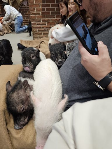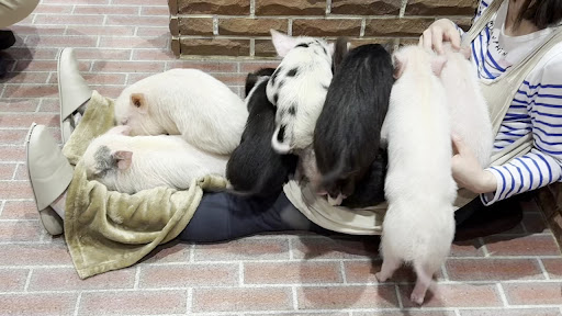 I passed by the store and was so happy to see cute pigs since I never interacted with them before, so I changed my entire day schedule to drop in. The pigs are really cute, and that’s what I thought before I actually went in. I thought that if I posted this review the store would be shut down. They tell you to sit on the ground with a blanket on your lap and the pigs climb on you and you can pet them. The pigs started sniffing and chewing on my clothes and hair and climbing under my skirt - if you haven’t seen pigs before which I hadn’t, they’re always sniffing and licking the ground and trying to eat whatever is in front of them since they have poor eyesight. I was fine with it as a germaphobe UNTIL the living nightmare started. A bunch of pigs just started peeing and pooping. The staff is decent about picking it up before it builds up, but the smell is really horrible and that is why they call it a pigsty. They opened the windows but it’s not nearly enough at all. Usually petting zoos are outdoor with a lot of fresh air. This place is in a closed space and the smell knocks you out. Besides the smell, the pigs started eating the poop and rubbing their noses all over it. And on the ground outside the litter area there are pee streaks. And on their bodies too. After that I wanted to burn all of my clothes as well as my hair which the pigs were licking and rubbing their noses on and probably just burn my entire body too. Because they’re covered in their own pee and poop and rub their noses all over you thinking you’re food. Of course I left early and canceled the treats so I never fed the pigs either, and I didn’t want to pay at all after this, but it’s a low entrance fee compared to other animal cafes. And at the cashier on the entrance level, the pigs there started pooping right next to the register. (And no one picked it up)
