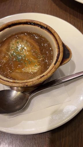 This time, we ordered the beef and chicken combo set, along with a grilled chicken steak, plus onion rings, fries, and fried chicken platter. The soup was onion soup, which, according to the menu, is the same one Marilyn Monroe drank for three days straight(but not sure the story behind). The grilled shrimp was fresh and juicy, even splashing onto our faces, and the sauce on the steak had a nice, rich aroma with a hint of wine. The drink bar offered a wide variety of beverages, including fruit mango juices and tropical fruit teas from a nearby fridge, which we found to be a nice touch. Additionally, the restaurant provides free parking as long as you dine there, which is very convenient for those who drive.