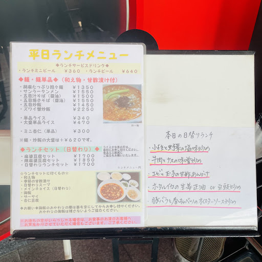 ◆ランチセット◆ ・麻婆豆腐セット ¥1480 ・陳麻婆豆腐セット(激辛)¥1630 ・日替わりランチセット ¥1480 ☆ランチセットにつくもの☆ ・和え物 ・季節の甘酢漬け ・日替わりスープ ・メインチョイス(日替わり) ・御飯 ・ザーサイ ・杏仁豆腐