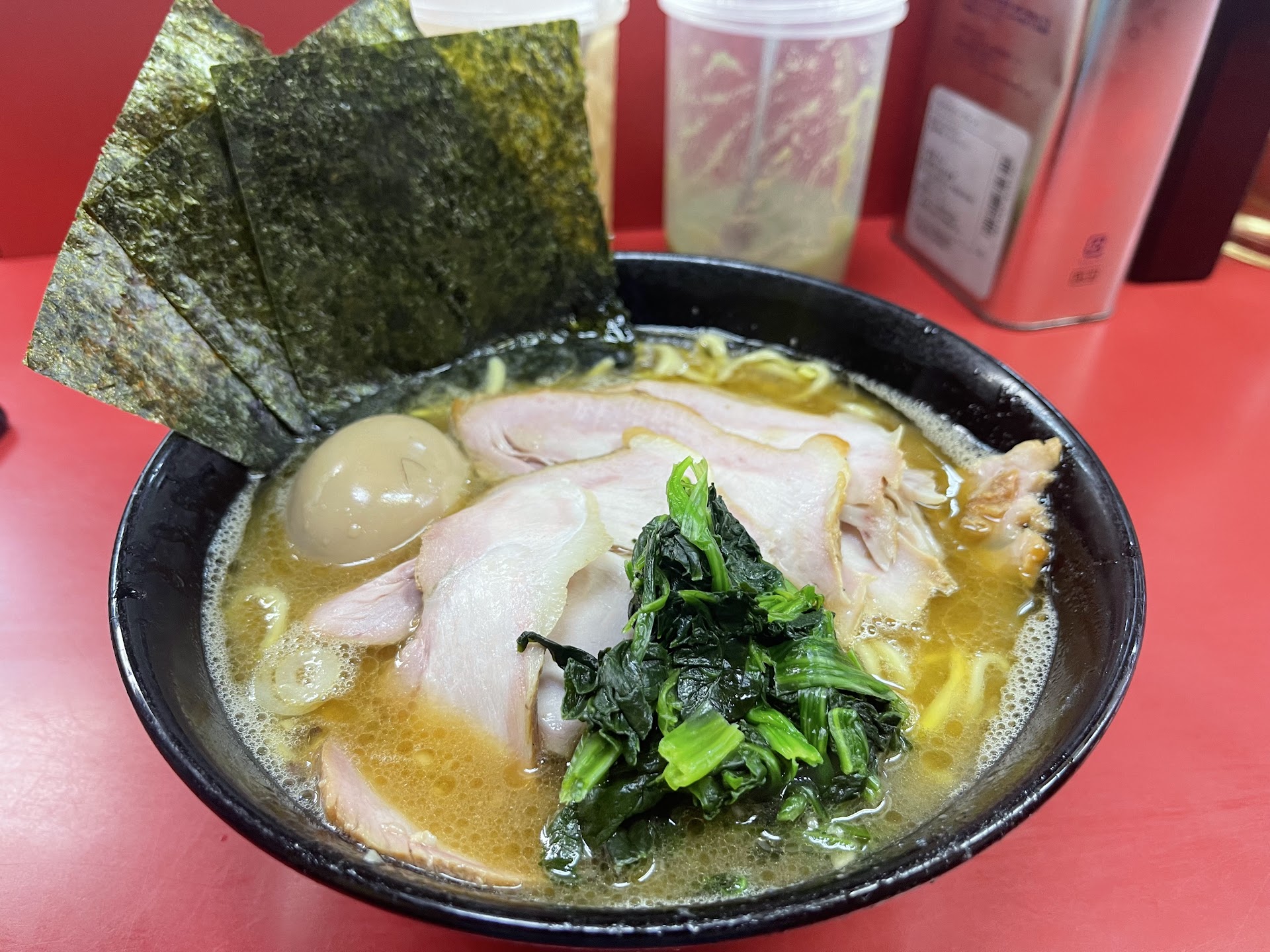 Read more2024.7.13再訪問 土曜日なので並ぶかと思い自宅を3時半に出て向かい4時45分頃到着、その時既に25番でした 先頭の方は一体何時から並んでいるのでしょう? 結局3巡目に入店、入店前にチャーシュー麺購入、好みは普通にしました 4時35分着丼です スープから飲むと美味塩っぱい正に直系の味です 鶏油マシが出来なかったのが残念ですがヨシとします 先日風邪を引き病み上がりなので並でも充分の量に感じました 以前塩っぱ過ぎたり麺量がめちゃ少なかったりした事ありますが今回はバッチリでした ごちそうさまです 2024.3.15再訪問 朝一の杉田家スープは間違い無い旨さなので早起き訪問 4時50分着で並び15人ほどです 金丼狙いなら4時着で無いと厳しそう ギリギリ一巡目から外れてしまい食券のみ購入、並チャーシューとまぶしにしました 4時15分に着席するとまもなくまぶしから着丼、値段なりの豚丼です 続いて本丸のチャーシュー麺硬め登場 スープから飲むと?!塩っぱすぎ! 完全に濃い目コールと間違えてます 他は鶏油の量も麺の硬さも良いのに何故間違えるのか不明 いつもなら完飲しますが塩っぱすぎて完飲不可 ごちそうさまでした 2023.10.14再訪問 土曜日の15時に到着30人以上の並びで並チャーシュー麺と海苔トピ、お土産ラーメンとお土産海苔を購入し並びます およそ1時間で入店、事前に硬めをお願いしたので直ぐ着丼しましたが写真の通り麺が見えません 青菜も雀の涙程度でスープを飲むと薄くとても今まで食べた杉田家とは思えない味 箸を丼に入れるとびっくりの麺量です 2分で完食は半麺以下の量です 直ぐ食べ終えお土産を渡されましたがこちらは普通の量でした まさか麺量が半分以下の下方修正とは思いたくありません 恐らく麺上げの東南アジアの方が間違えたのかと信じたいですが次回同じ間違えをしたら店内食はせずにお土産利用にします 色々と残念でした 20数年ぶりに再訪しました 当時はまだ20代で現在50近いおじさんの味の思い出は良い方向に矯正されていたと思いますが記憶の味よりあっさり感じました 昔は醤油の香りが立つ尖った感じ、かつ鶏油のまろやかさのコラボで中毒性があった様な気がしますが今は万人向けのマイルドな感じがします
