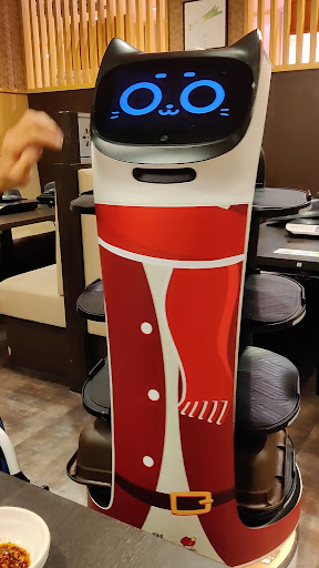 This is a very family friendly restaurant. The way it works is you order everything via a tablet at your tables. There are two hot plates on the table with cast iron pots. You get to pick your sauces you have up to 2 sauces in a pot. Then choose the type of meat 🍖🥓 you want . They have chicken 🍗 pork beef 🍖 and several types of veggies. You can go to the buffet and get as much as you want. A nice treat is when the food is ready it brought out to you by the cat 😺 robot. Then you cook or boil the meat. There are several types of sauces that you can pick as dipping sauce.they had about 6 different flavors. For dessert which is included you can have cotton candy or soft serve ice cream 🍦 or a variety of other types. The tricky thing is you have a time limit at the table so you have to finish all your food by then. It's great spot the meats were nice the sauces...