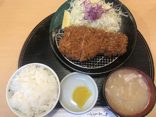The set comes with white rice, thinly sliced cabbage, and tonjiru (pork soup). The soup was filled with other vegetables, like onions and daikon, which made...