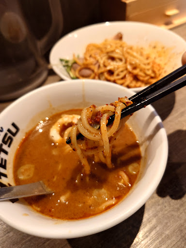 Read more2023/11/24 初訪問 外での仕事が一段落したので久しぶりにつけ麺を食べたくてGoogleMapで調べてたらこのお店を見つけたので訪問してみました。 12:20頃に入った際は、ほぼ満席の状態でしたが待たずに座れました。 店内は長いカウンターと4人掛けテーブル席がいくつか。奥行きがあり、雰囲気はチェーン店のラーメン屋さんという印象です。 支払いは現金のみで店入ってすぐ横にある券売機でメニューを決めてチケットを店員さんに渡してから着席するシステムです。 『味玉辛つけ麺』1200円を選びました。 メニューを待っている間にホールにいる店員さんに「注文が前後してしまいます」とお断りをいただきましたが、私は特に気にしないので了承しました。過去には40分待っても提供されずに放置されていたこともあるのでそこらへんは鍛えられています。 『紙エプロン』と『揚げねぎ』は店員さんに頼めば出してくれます。 それはさておき10分程で提供されたので待ったなという感じはしませんでした。 見たは辛そうに見えたので汗をかくことを覚悟して食しました。 まず驚いたのは味玉が冷たかったことです。てっきり温かい味玉が出てくるのかと思っていたので面食らいました。麺だけに。 麺は長くて歯ごたえがあるストレート麺です。つけ汁とよく絡みます。 つけ汁は魚介系ですがそこまで魚の味は全面に出ていないです。 チャーシューは大きいですが、薄くて脂身があまりないので食べやすいと感じました。 途中、味変で酢を麺に絡めて食べたのですが自分の口には合いませんでした。酢を入れたことを少し後悔しました。酢に合わないつけ麺というのもあるのだなと勉強になりました。 最後に割りスープを入れてらサッパリしたのでゴクゴクと飲んでたら額から汗が吹き出てきて、飲み干したいのをグッと堪えて丼をテーブルに置いて立ち去りました。 次回はまぜそばを頼みたいと思い...