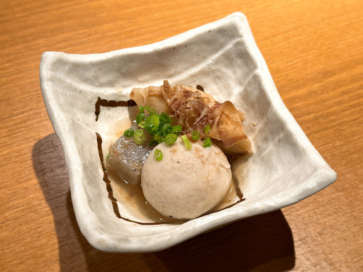 四品目は『牡蠣の昆布〆』 これが素晴らしく旨かった!牡蠣の旨味と昆布の旨味が噛みしめれば嚙み締めるほど染みこんできました。もみじおろしのっけてポン酢でいただくのも旨かったなぁ~ これ最強のアテかも知れない。 この旨味を感じつつお願いしたのが【百十郎 赤面(あかづら)大辛口純米酒】(岐阜県/林本店)。米の柔らかい香りと旨味、少し舌にさわるような酸味も。辛みから甘みへと変化する清酒が多い中で最後まで辛口をキープしてくれる、辛口好きにはとてもいいと感じました。 続いて、海の味を感じながらいただきたかった【本醸造 黎明 上撰】(沖縄県うるま市/泰石酒造)をお願いしました。初めて日本最南端沖縄の蔵元が造る清酒をいただきましたが泡盛にも通じるような酸味があってちょっとした刺激が心地良い日本酒でした。