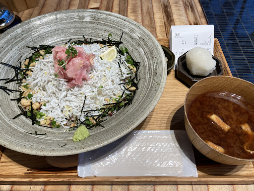 横浜駅下車時、どこかでお昼を食べたくて何となく入ったこちらのタワーでクルクルしてる際に、発見。 看板を見ていると、しらすの説明をしてくださって、席も今なら〜と案内してくれて、メニューもとても美味しそうだったので入ってみることにしました。