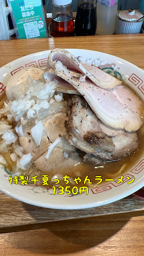 直接注文スタイル。 メニュー表は昔は写真ありでしたが今はないです。メニューは豊富です。 ちょっと高いですが特製千夏っちゃんラーメン注文。 提供時間は早かったです。 全体的に白っぽく具材も昔の写真と比較すると寂しい。原料高に苦しんでいる様子が見られますね。😢 味の方はおいしいです。二郎系のような家系のようなラードの香りが食欲をそそります。 隠し味にハチミツとのことで、君津の大ちゃんラーメンのようなほんのり甘い感じをイメージしていましたが特にそれは感じませんでした。 麺が細麺のコツコツ系で個人的には好きなやつ。 チャーシューも柔らかいももと肉感のあるバラとでいいですね。 せっかくなので和え玉を注文したところボリューム満点。丸々一人前150gは茹でている感じ。これで300円は安いです。正直2人だったら1つでいいかな😅
