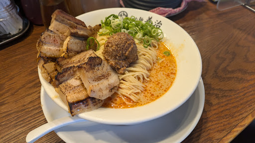 Seared chashu adds a smoky touch, with a good fat-to-meat balance. Toppings include green onion, menma, komatsuna, a seasoned egg, and a pickled plum. The egg is richly flavored with a creamy yolk that pairs perfectly with the soup.
