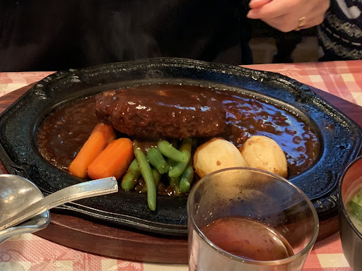 写真は網焼きステーキのランチ。 妻はビーフシチューのランチにして、お互いに一口ずつシェア。 ステーキランチは、ソースポット(で正しいのでしょうか)がテーブルに運ばれてきた時点で期待値が高まり、次いで、熱々の鉄板に煙が立ち上ったステーキが来ると嬉しくなりました。