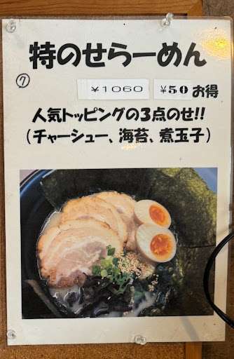 最後に私が好きな「せぶん」の1番の特徴は中盛と 大盛の存在です。 この凄さ気付けて嬉しかった。 足立区の田中商店で初めてラーメン食べた時、本当に美味い豚骨ラーメンは替え玉するべきじゃない最後まであんなに美味しいスープのバランスを崩したくないと感じて替え玉やめたのです。 でも、物足りない時は有りましたがおかわりするなら ラーメン1人前と決めたのですが頼んだ事はありませんでした。 そして「せぶん」で人生2回目の替え玉したくないラーメンとの出会い、中盛、大盛の発見。 正にパーフェクトワールド 完璧なのです。 あの完璧のバランスで完璧に満腹になれる幸せ。 替え玉の量よりスープのバランスに移行しつつある中年だけで無く若い人にこそ試してほしい。 だって中盛でたった60円、大盛でも120円アップですよ、もちろん麺だけで無くスープも増えて! (替え玉100円) 1番コストの掛かるしっかり炊いて乳化させ、嫌な獣臭を消したスープ増量分ほぼ無料。 中盛または大盛で完璧なラーメンのバランスを楽しんでからでも替え玉は遅くないしスープもたくさんあって最後までスープも一緒に味わえる。 私は中盛の硬めですが麺の伸びを感じた事ありません もし、あの麺有って中盛、大盛がメニューに存在してるなら、ちょっと恐ろしいです、「マスター」の事が