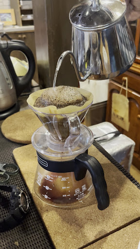 コーヒーを淹れてくれてる時も誰もいなかったので終始近くで見学。ドリップしてる時にコーヒーが泡立ってたのでなんでか聞くと「新鮮なコーヒーは泡立つの」って教えてくれました。あたし、元々コーヒー豆が白いのも知らなかったので衝撃的でした(^◇^;)