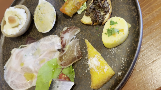 まずは2切れのパン。ローズマリーがいい香り。そして彩りが美しい9種類の前菜。あんまり食べたことのないような前菜が多く、特に手前側にある三角形のとうもろこしのお料理は初めてのお味で美味しくて感激♡
