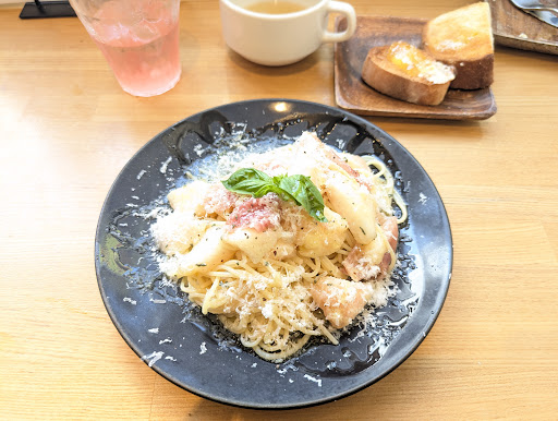 サラダバーにキヌアって米みたいな物があって、お姉さんにこれ何?って聞いたらにニッコリ笑顔で「キヌアって穀物みたいなもの」って教えてくれました。 うん。そう書いてあるね。 後で調べたら、超栄養価あるスーパーフードなんですね。厳密には「擬似穀物」なんだそうな。 初めて食べたよ。 念願のサラダバーで野菜を盛り盛りしてドレッシングでちょい悩み。 数種類あって 名前は忘れたけど美味しいドレッシングでした。 ドリンクは、コーヒー、紅茶の他などがあった中で、アップルジュース、アセロラジュースもあり、バイクであちー思いをした喉に最高のご褒美となりました。 2回目のサラダおかわりしてたら、先に来ていたお客さんが店員さんに「桃と生ハムの冷製フェデリーニとても美味しかったよー。去年食べて美味しかったのでまた来ちゃいました。」なんて話してた。 ん?ってメニュー見たら、数量限定なんですね。それももう少ししたら桃が入らなくなって別の組み合わせになるような話をしてる。 限定ってことと、口コミに弱い私。こりゃいま食べなければって思ってしまい、桃と生ハムの〜を追加注文 美味い! 桃と生ハムって合うんですね。 生ハムの塩味かな?ちょっと塩味が強かったけど、それはそれでウマー。 ランチタイムだったからメニューも少なかったのかな? 帰り際にディナーメニューを見たら美味しそうなメニューがたくさんあった。 今度は夜来よっと。ワクワク 店員のお兄さんとお姉さんの笑...