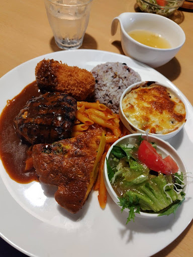 スペシャルプレート、お肉の味がしっかりしでふっくら美味しいハンバーグと食感の良いカニを感じられるカニクリームコロッケ、丁度いい塩梅のトマトソースのペンネ、たっぷりの熱々グラタンにほぼキッシュですが卵の味もしっかり残したオムレツ、自家製ドレッシングのサラダと雑穀米とボリュームがあり全て美味しく頂きました。