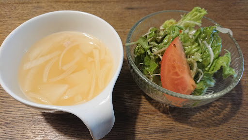洋風きのこスープ。 コーヒーは美味しかった!! [少なくともコーヒーは上海王を越え、衣笠商店街一の旨さと感じた。 ・日替わりスープ、サラダ ミルクカレーオニオンスープ。 めっちゃ美味しかった!