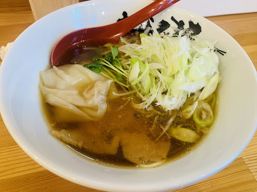 おひとり様お客さんが多い時間帯でした。 着丼、綺麗な見た目。メンマが細切り。ネギはスープにヒタヒタで柔らかい。 チャーシューとカイワレ。 具入りのワンタン2枚。 麺は自家製麺で細麺。 古式醤油は滋賀県産でした。 香りが良い。