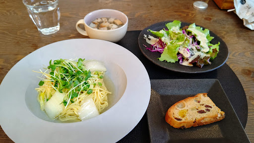 Read more食事は普通に良い。店内も、それなりにお洒落ですが、しょうがないかもしれませんが、平日の昼頃に伺ったら色々な業者さんとの打合せや宅配や営業の人達がやってきて普通に店内で対応するため、お客様以外の出入りが多くゆっくりできませんでした。週末は週末で、お客様で混むので、いつ伺えばゆっくりできるのかしら? 久しぶりに、また平日の早目の時間帯に伺いました。前回と同じ席に案内されたので人通りの少ない奥の別の席をお願いしました。そしたら何やら、その後ろで5人くらいの人達が何かの作業?仕事?をしておりました。別に話声がしたり気配が気になる事はありませんでしたが、地元の企業さんとなると平日の隙間日?に場所を提供したり、何か色々やってるのかなー?と思いながら食事をしました。私の気にしすぎなのか[もう食事に専念する場所]という感じは残念ながらしませんでした····土日祝とかは多分、通常通り食事のみする場所なんだろうけど週末は混むから、正直あまり行きたいと思わないので、私にはむかない場所...