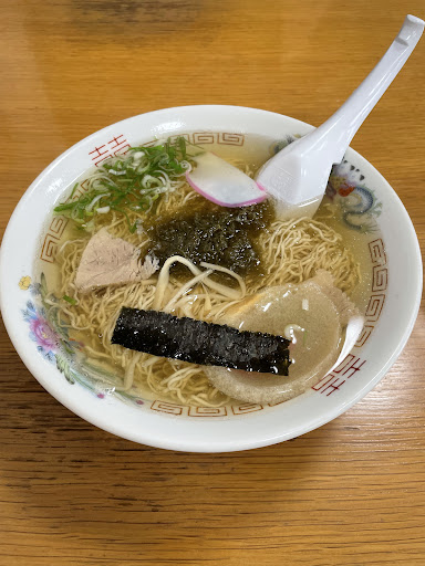 透明なスープ、トッピングはシンプルにカマボコ、オフ、メンマ、小さな海苔とチャーシュー、刻みネギです