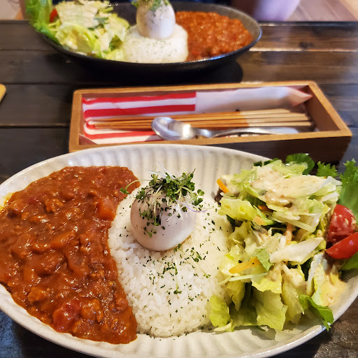 カレー、味玉が載ってきてかわいい。 サラダとカレーでボリュームもあって満足な内容。