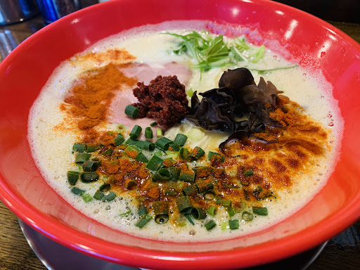 クリーミーな鶏骨スープに浮かんでる唐辛子パウダーが辛さを物語ってます(笑) 鶏骨でこれだけの濃厚スープができるなんて、いったいどんな製法なんでしょうね。
