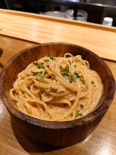 Read more住宅街の中にある、古民家を改装したオシャレな居酒屋です。一見分かりづらいですが、夜になるとガラス越しのカウンター席の灯りが雰囲気を醸し出し、お客さんが集まってきました。若い年齢層のお客さんが多かったです。 厨房を囲む形のカウンターで、少々お客さんとの距離が近すぎる感じもしましたが、常連客らしき人たちはマスターとの会話を楽しんでいました。(そういう雰囲気が苦手な方はやめたほうがいいかも…)奥には個室もあるようでした。 料理は創作料理といった感じで見た目でも楽しむことができます。全体的に濃厚な深い味わいで、後半飽きがくる感じではありましたが、お酒にはぴったりだと思いました。特に明太子のパスタが美味しかったです。 残念だったのはマスターと女性店員の私語が気になったところです。スタッフ同士仲がいいのは良いことですが、お客さんからの距離が近く、全て見えてしまうだけに気をつけ...