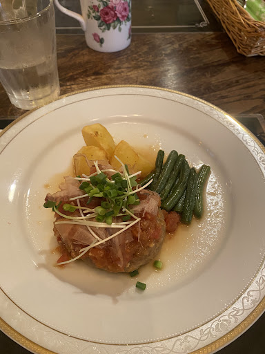 Very cute and rather private. Girly is the best way I can describe the atmosphere. I get the feeling not many people know about this place. I went for lunch with a friend and only three other tables were occupied throughout the hour we ate there. The (English) menu doesn't state outright, but the dish you order comes with courses. I got the hamburger steak, which came with a salad, then clam soup, then the main dish, and finally a strange but delicious oat soup dessert with an oatmeal cookie. You also get to choose a drink from the menu with the meal, which are mostly coffees and teas. The cafe Alexander is pretty good. They sell various merchandise, mostly bathroom-related items. I bought some rose-scented hand soap, which smells delightful. Definitely recommend for anyone with a strong affinity to femininity. Yen only, cards...