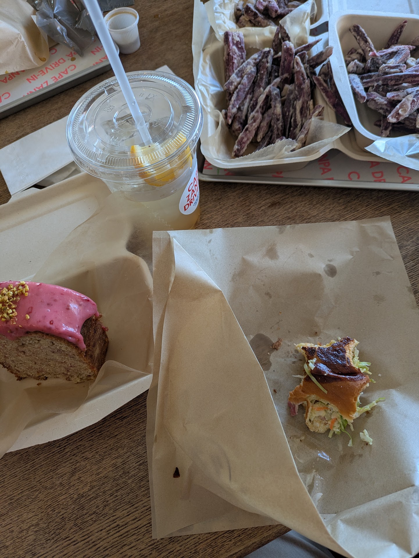 Read moreThis was a "drive-in" that you should understand is not a drive through style restaurant. That is just the name (for some reason). It is by the giant shisa statues near Zanpa Beach. It. Simply. Has. The. Best. Chicken. Sandwich. In. The. World. That is it: THE BEST. Juicy, plus bacon. I feel that having the best anything in the world should be touted: this is it. Unbelievable sandwich: the bun alone is worth the trip. (And to think I once waxed poetic about Popeye's and Chick-Fil-A.) Plus...the sweet potato fries are out of this world. Delicious. Delicious. Delicious. Interesting drinks as well. At the end I elected to try the raspberry cardamom cake and while it was good I didn't really taste any cardamom....