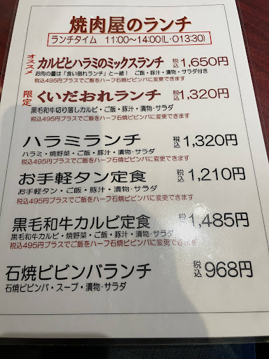 Read moreランチタイムに行きました お手頃なランチタイムメニューがありましたが、やはり値段相応でお肉の量が少ないので単品で追加注文しないと満足な量が食べられなかったです。 無料調味料があり、特製唐辛子、おろしにんにく、コチュジャンがありました。 タレは醤油とゴマダレがあり、タンを頼むとレモンがついてきます。 お肉と醤油タレはよくあい、ご飯が欲しくなる味でとても美味しかったです。 食事中、または食後にはセルフでコーヒーが飲めます。なんと、無料です 一杯のみとは書いてありませんが他の人も飲めるように数杯で我慢しましょう。 また、お会計後には口直しの飴がもらえます。昔はガムだったのですが、飴のほうが需要が高いと...