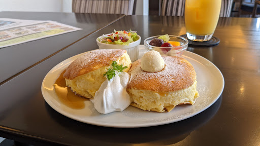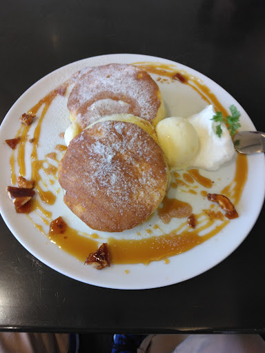 Read moreここのパンケーキは世界①じゃないかと思うくらい、とても美味しいし、気に入ってます!おしゃれな外観で交差点の角に建ってます。平日午後2時頃に行ったときにも、駐車場も満車(23台)で、店内も満席(46席)で10分くらいレジ横の椅子で座って待ちました。パンケーキはオーダーをしてから作られるので焼き上がりまで+30分くらい必ず掛かります。美味しいと分かってるので楽しみで、全ての待ち時間や行列になったとしても苦になりません。客層は女性が多く(男性1名)、年代も10~60代の方がおられました。道路沿いはガラス張りで、すりガラスになってれば1番良いと思いますけどクリアなので、4テーブルの席はお互いに車の人や歩行者見えてしまいますが、ロールブラインドもあります。テーブルの間隔は狭くないので、ゆったりとした寛げる空間になってました。 ふわふわタイプのスフレパンケーキで、一口食べた瞬間に幸せを感じれて、口の中で食べるというよりは、やわらかくて溶けてるような感じもします。スイーツに関心が無い人と行ったときも、自然と「これ美味しいわ!」と言ってました。出来たら毎日...