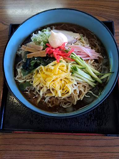 店内は店舗北側の出入口から南側に向かって奥になる。 入ってすぐの所にテーブル席が確か4つ。 奥に座敷の席が2テーブル分あり、座敷の所にテレビもあり。 カウンターにも数席ありました。 レジはカウンター左側で。 水は息子さんだろう店員が持ってきてくれる。 と同時に冷やし中華大盛りを注文。待つこと数分、 わっぱ型の皿に氷が数個、程よく冷えてある程度の酸っぱさのあるスープ。 ある程度は冷えている細ちぢれ麺、細切りのハムときゅうり、錦糸玉子、メンマ、ワカメ、ネギ、チャーシュー1枚の上にマヨネーズ、紅しょうがといった具がある。 店内はThe昭和といった感じが至る所に。 エアコンはなくレトロな扇風機。 大盛りは全て100円増し。 店先に準備中の看板がなければ営業中。 18:00までの営業になってはいるが14:00くらいに行くと準備中の時もある。 まぁ...