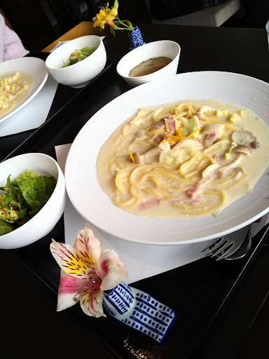 (1年前) メニューの名前忘れてしまいましたが💦柚子が香るクリームチーズパスタをいただきました(サラダとスープ付き)🍴キャベツ・キノコ・ベーコンもたっぷり入っていてパスタの量も多めで結構食べごたえがありました😊トレーの片隅には可憐なアルストロメリアが添えられててほっこり♥