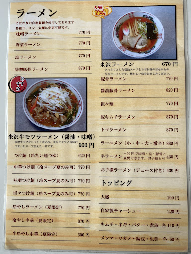 Read more北側入口から入ってすぐのところの右側の壁に名前と人数、車の番号等書く所あり。 左側には椅子があって二人ぐらい待てるみたい。 入ってすぐ左側正面にカウンター、左側窓側に席、入ってすぐ右側にも席があります。 メニューは各席にあるようです。 米沢ラーメンとCセットの半チャーシュー丼を注文。 あまり待たないうちに着丼。ただ、半チャーシュー丼はあとから着丼。普通トレーに両方持ってくるのが別々に来たことは他の店とは違う点。 米沢ラーメンは至って普通に美味しい。特段美味しいという訳では無い。 麺は細ちぢれ麺で問題なかった。 半チャーシュー丼は、ご飯にかかっているニンニクのオイルだろうかよく分からないがそれだけはアクセントになって美味しかった。 期待はずれだったのかも。 2025.6.22冷やし中華大盛りを頂きました。 麺とスープが冷えてました。氷が入っていればなおよしでしたが。酸っぱさについては無かったので卓上の酢で追い酢をして食べました。注文時にマヨネーズはいるかどうかを聞かれます。麺は...