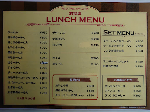 Read more数年前に偶然見つけたお店です。 昔から営業していたようです。 今回はヨリカ(地域マネー)を使うためにこちらにて"ナポリタン"を頂きました。 喫茶店の様ですが、主なメニューはラーメン類の様です。 頂いた"ナポリタン"は焼き目がしっかりついた美味しい"ナポリタン"でしたが、スープなどは付かないのと、量が少なめなので、男性にはちょっと物足りないかと思われます。 少食の方ならちょうど良い量かもしれませんね。 ラーメン好きな自分なので、次回はラーメン類を頂こうと思います。 ちなみに駐車場は道を挟んで向かい側に3~4台ほどスペースがあります。 #冷やし...