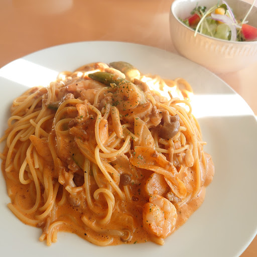 ãã¹ã¿ãé£ã¹ãããŠåããŠèšªåããŸããã åºå ã¯ããããŸããšããŠããªãããããŒãã«ãšããŒãã«ã®ééãåºãããšãŠãã®ã³ã®ã³ãšéãããŸãã çªã倧ãããŠçºããããã®ã§ã倩æ°ã®ããæ¥ãªã©ã¯ãã£ãŠããã®ãåºã ãšæããŸããã æµ·èãšæšã®åã®ãããã¯ãªãŒã ãæ³šæããã®ã§ãããã§ãããŠã¢ãã¢ãã®ç¶æ ã§éã°ããŠããŠãéãããªã¥ãŒããŒã§ãå³ãçŸå³ããã®ã§æºè¶³æããããŸãã ä¹ ã ã«çŸå³ãããã¹ã¿ãé£ã¹ããªããšããæçã ããªãâ 5ãä»ããããããæåçã§ããã