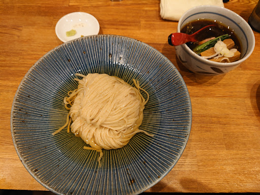 2023.7.13. 秩父での仕事を終え、もう少しでラストオーダーというタイミングでしたが『終わったらあそこへ行こう!』と密かに狙っていた、まだ食べれてなかったかの北部エリアの名店へ。淡麗系のイメージ、さて何を食べようかなぁと食券機を眺めてみると、おぉ!本日限定でつけ麺が昆布水つけ麺になっているですとー!?そんな事言われたら… 本日限定の昆布水つけ麺(醤油)、ギョウザをいただきました。 つけ麺、つけ汁が塩と醤油を選べれるようになっていたようですが初めてだったので店員さんにどちらがオススメか伺い醤油をチョイス。まずは麺、全粒粉入りの中太ストレート、キレイに畳まれたものをスルスルっとほどいてそのまますすってみると…おや?コレは…そばですね!?(昨日のお昼に食べた(^_^;))つけ汁、鶏油の浮いた濃いめの色加減の見た目、麺をくぐらせてすすってみると、いやコレやっぱりそばですよ!(昨日のお昼にた(略))雰囲気的には鴨つけそばの様な佇まい、空腹に染みる〜。そばの薬味かのように岩塩、わさび、柚子胡椒が小皿に添えられており、もはやそばですよ(昨日のおひ(略))岩塩だけでもすいすいと食べ進んでしまいます。麺を食べ終わったら、麺の浸かっていた昆布水をつけ汁に投入、いや麺が浸かっていたんだからそば湯みたいなもんじゃないですか、これはもうそばでしょ!(きの(略)) ギョウザ、中のあんが野菜と肉のバランスがいい感じの柔らかさ、つけ麺でそばを食べている様な感覚から『あぁ、つけ麺を食べているんだ』と引き戻してくれる立ち回りがニクい(なんのこっちゃ)。 初見で限定メニューをいただいてしまいましたが、むしろ限定を食べれて良かったです。またお邪魔した...