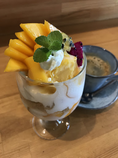 ドリンクメニューが豊富で、夜ならあれこれと注文していたことだろう。(写真はメニューのごく一部) 写真のマンゴーパフェは、カットマンゴーにマンゴーアイスそしてドラゴンフルーツやパッションフルーツまで楽しめて南国気分を一層高めてくれる。生クリームをたっぷり使用しているが、甘過ぎず、マンゴーの酸味とも相性バッチ...