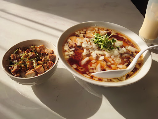 2025/06/22 16:00前、冷やしらーめん(800円)を求めて遣ってきた 茹で玉子が無くなり、其れでも良ければの条件付きでお願いした、あと豚バラ丼(200円)と玉葱(30円)も 良く締められた麺は、表面にオイリー幕の和風スープに浸かってる そのスープは薄味で油脂が強く主張し、醤油味が圧倒され気味で、旨いけど残念な感じ なので、サッパリさせる為に『刻み玉葱』を投入し、良い感じになった 豚バラ丼は甘めのタレで安定した旨さ😋 替玉1/2を追加注文して、完食完飲 良く締められた替玉麺でも50円とは驚くコスパ ご馳走さまでした