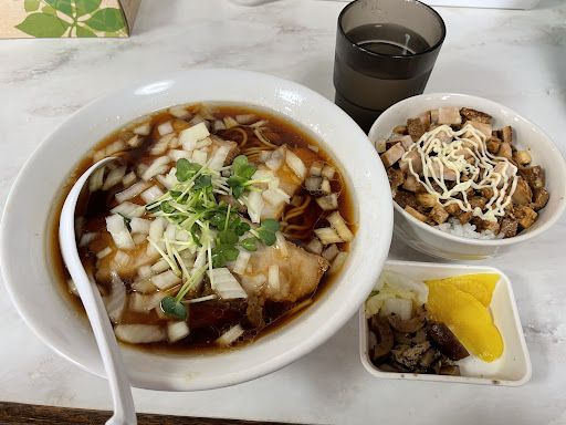 2025/07/31 10:40既にflying開店し前4組6名 カウンター中央に座り、味噌と迷う… 爺ラーメンを麺硬めで玉葱追加と焼豚丼を注文 無料の漬け物とお初のおにぎりを頂く ラーメン来る迄におにぎり完食 まもなくして2品が着丼、玉葱を追加投入して食すると『今日の刻み玉葱は凄く辛い‼️』 スープの塩分濃度は1.6と高濃度 そのスープを焼豚丼に掛けてサラサラとお茶漬け感覚 ラーメンも完食して、ご馳走さまでした *******************