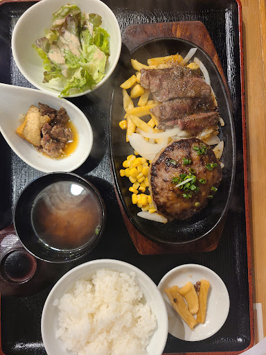 Read moreA fantastic little Hamburg/steak restaurant with decent parking that's often very busy. It has a waiting area for such occasions. It's not a super high-class restaurant, but it beats the chain restaurants hands down, and may be suitable for small/medium families, but probably not picky eaters. Meals are 'teishoku" (set meals), so miso soup, a small salad, pickled stuff, rice, and stewed sinew are provided with the main course of your choosing. Chicken, skirt steak, Hamburg, and (I think) top blade are the choices, with sweet or spicy sauce options for the steak that come on a sizzling platter with a few veggies for good measure (bibs available if needed). There are a few options of how many grams of meat you get which will, of course, affect the price, but worth it if you're feeling extra hungry.