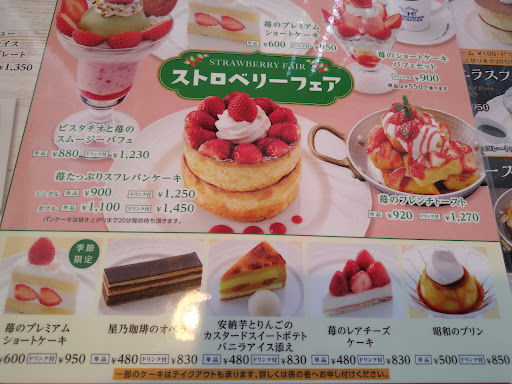 ーーーーーーーーーーーーーーーーーーーーーーーーー コーヒーは星野ブレンドより、自分は彦星ブレンドが好みです。 食事も充実しているので、ランチに利用するのも良いと思いますね。 スィーツはスフレパンケーキが売りです。 焼き上がるまで、時間が20分程掛かりますが、お代わりコーヒーが安価で頼めるので、待っても良いかなと思います。 また、ケーキやパフェもあり、子連れや女子に受けが良いと思います。 ※分離された、タバコ席もありますので、スモーカーは気遣いなく、お茶を...