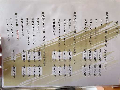 改めてメニューで拝見すると、豚骨ラーメン、醤油ラーメン、みそラーメンの三種、それぞれ大盛と替玉、チャーシューや生玉子のトッピングもあり、ギョーザとメシのセットと単品もあります。