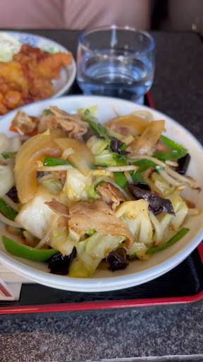 野菜炒めは器の幅は大きくないけど、そこそこ深くてなかなかのボリューム。 肉もそこそこ入ってるし、キャベツにピーマン、もやし、玉ねぎ、キクラゲ、にんじんと野菜もたくさん。 味付けは若干濃いめだけど絶妙でご飯が進みます。